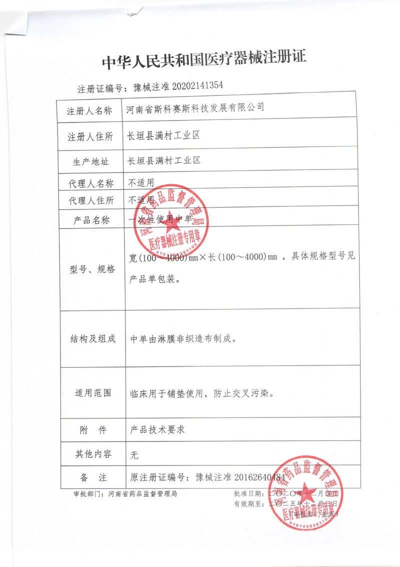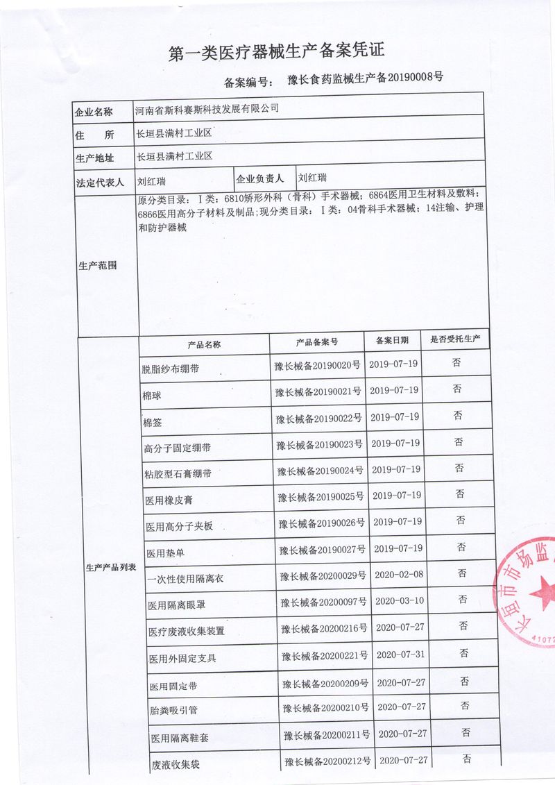 河南省斯科賽斯科技發(fā)展有限公司創(chuàng)建于 2011 年,位于“中國醫(yī)療耗材之都”- 河南省長垣縣,西臨 308 省道,南靠新菏鐵路,北依長濟高速,交通便捷,經(jīng)濟發(fā)達,環(huán)境優(yōu)美。斯科賽斯積極進入醫(yī)療健康和服務(wù)領(lǐng)域,秉承為用戶創(chuàng)造價值的理念,專注于醫(yī)用耗材解決方案的研發(fā)和運營,并為用戶提供完善的產(chǎn)品解決方案;  斯科賽斯主要生產(chǎn)醫(yī)用麻醉系列、醫(yī)用高分子系列、醫(yī)用敷料包系列、醫(yī)用無紡布系列、醫(yī)用防護系列、醫(yī)用脫脂棉系列、生物材料制品類等七大類、100 多個品種、400 多個規(guī)格的產(chǎn)品。公司占地面積約 30000 平方米,建筑面積20000 平方米,擁有 10 萬級的凈化車間總面積 10000 平方米。擁有國際先進水平的生產(chǎn)設(shè)備和檢測儀器,技術(shù)裝備精良,檢測手段完善,為醫(yī)療行業(yè)的不斷發(fā)展進步提供保障。公司順利通過 ISO9001、ISO13485 質(zhì)量管理體系認證?! ∷箍瀑愃箞猿盅邪l(fā)高科技新產(chǎn)品,力爭在醫(yī)療器械關(guān)鍵領(lǐng)域取得技術(shù)和研發(fā)的重大突破;立足國內(nèi)和國際兩個市場,逐步實現(xiàn)管理理念、經(jīng)營機制、人力資源、技術(shù)、產(chǎn)品、市場等全方位對接,提高企業(yè)的核心競爭力;過去的歲月里,斯科賽斯砥礪前行,誠信務(wù)實,銳意進取,不斷創(chuàng)新,用自己的睿智和辛勞,以富有責任感的使命,在探索中追求,在追求中超越,致力于成為值得信賴的醫(yī)療用品生產(chǎn)企業(yè)!在未來的日子里,斯科賽斯將一如既往豪情滿懷,信心百倍,攜手并肩,執(zhí)著追求,向更高的的目標前進,鑄造新的輝煌!